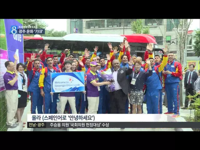 (앵커) 베네수엘라 선수단이 광주 유니버시아드 대회 참가 국가로는 처음으로 입국해 선수촌에 둥지를 틀었습니다. 선수단은 따뜻한 환대에 감사한다며, 대회 기간 한국과 광주의 문화를 알고 싶다고 말했습니다 한신구 기자의 보도 (기자) 중남미 국가인 베네수엘라 선수단이 광주 유니버시아드 대회 참가를 신청한 147개 ...