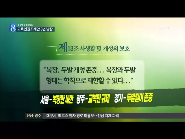 ◀ANC▶ 전남 교육공동체 인권조례안이 3년 동안 제정되지 못한 채 표류하고 있습니다. 전라남도교육청과 도의회 교육위원회가 조례 제정에 소극적이다는 점도 문제입니다. 김양훈 기자가 보도합니다. ◀END▶ 전남 교육공동체 인권조례안이 발표된 것은 2012년 2월 입니다. 학생과 학부모, 교사 등 모든 교육주체들을 한...