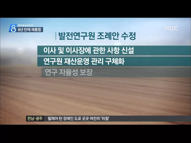 ◀ANC▶ 따로 따로 발전전략을 짜왔던 광주와 전남 발전연구원의 통합이 결정됐습니다. 큰 산은 넘었지만 풀어야 할 숙제는 산적해 있습니다. 양현승 기자가 취재했습니다. ◀END▶ ◀VCR▶ 잇단 미비점이 지적돼 조례안 처리가 보류된 지 넉달여 만에 광주전남 발전연구원 통합이 결정됐습니다. 전남도의회 재석 의원 5...