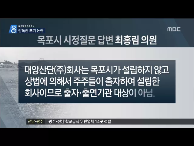 ◀ANC▶ 목포시가 지분 20%를 보유하고 있는 대양산단 주식회사를 출자·출연기관으로 지정하지 않기로 했습니다. 출자 법인에 대한 감독권을 스스로 포기하는 것이어서 논란이 예상됩니다. 신광하 기자가 보도합니다. ◀VCR▶ 대양산단 분양대책과 감독 문제는 목포시의회가 열릴 때마다 등장하는 단골 메뉴 입니다. 그만...